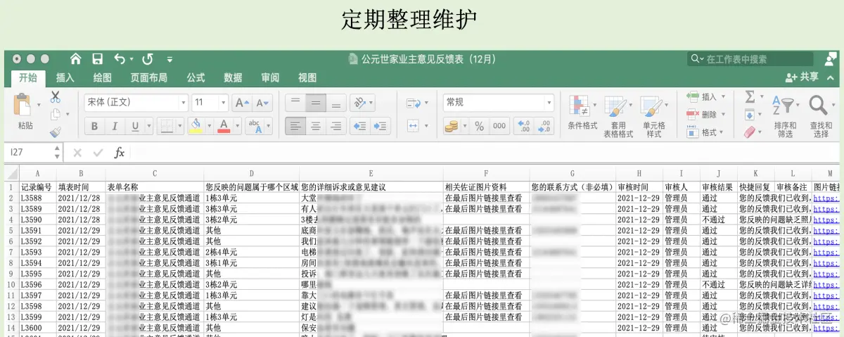 此外,扫码反馈还有一个好处:每次反馈和对应的处理都有记录。管理人员可以通过后台一键导出所有数据进行汇总分析,也可以定期整理反馈意见的受理情况并公布出来,营造一个公开透明的氛围,提高业主对物管的信任度和满意度。