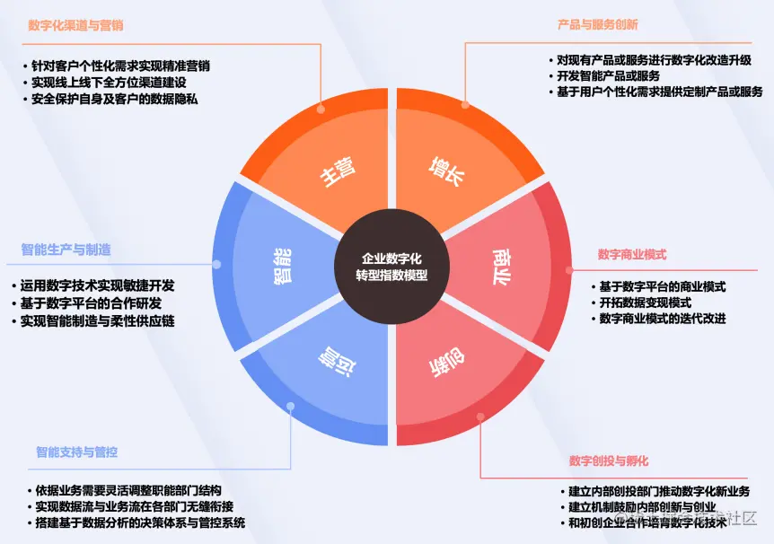 企业数字化转型指数模型:主营、增长、商业、创新、运营、智能。