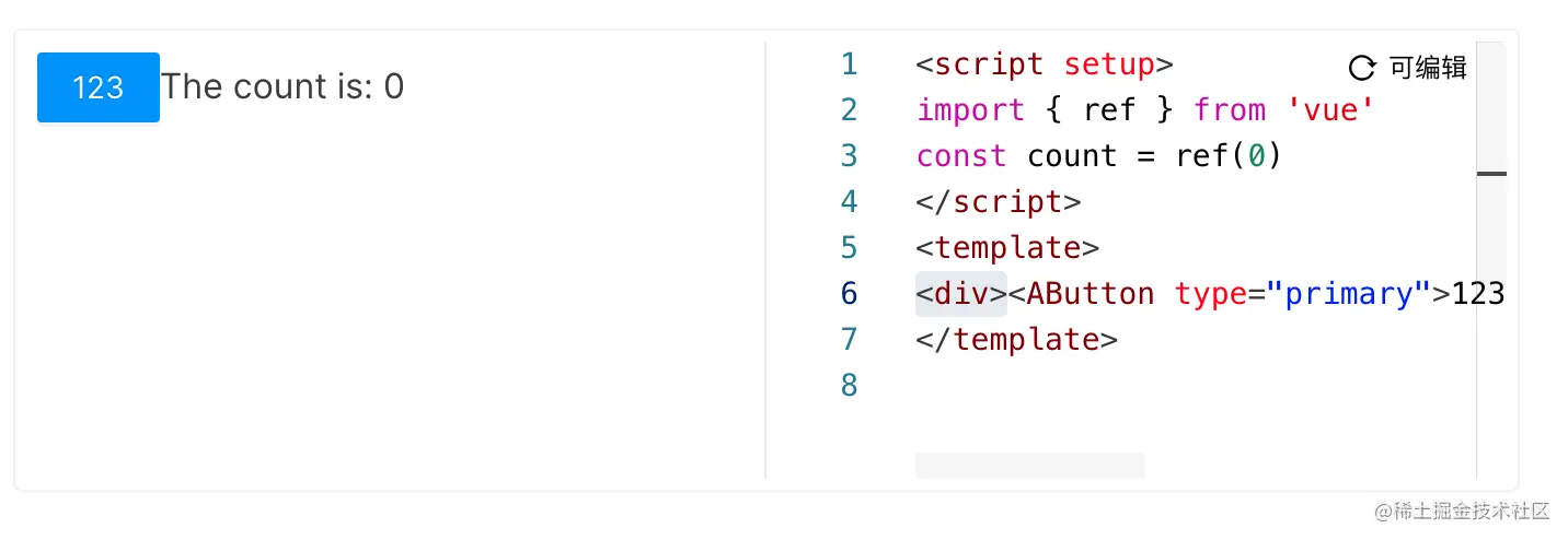 如果想要在可以交互使用 AntD 组件,即页面的代码框中修改 AntD 组件,渲染页面实时修改的效果,vitepress-demo-editor 插件中,也可直接使用,需要注意的是,要使用 AntD 组件的 name 值,如下: