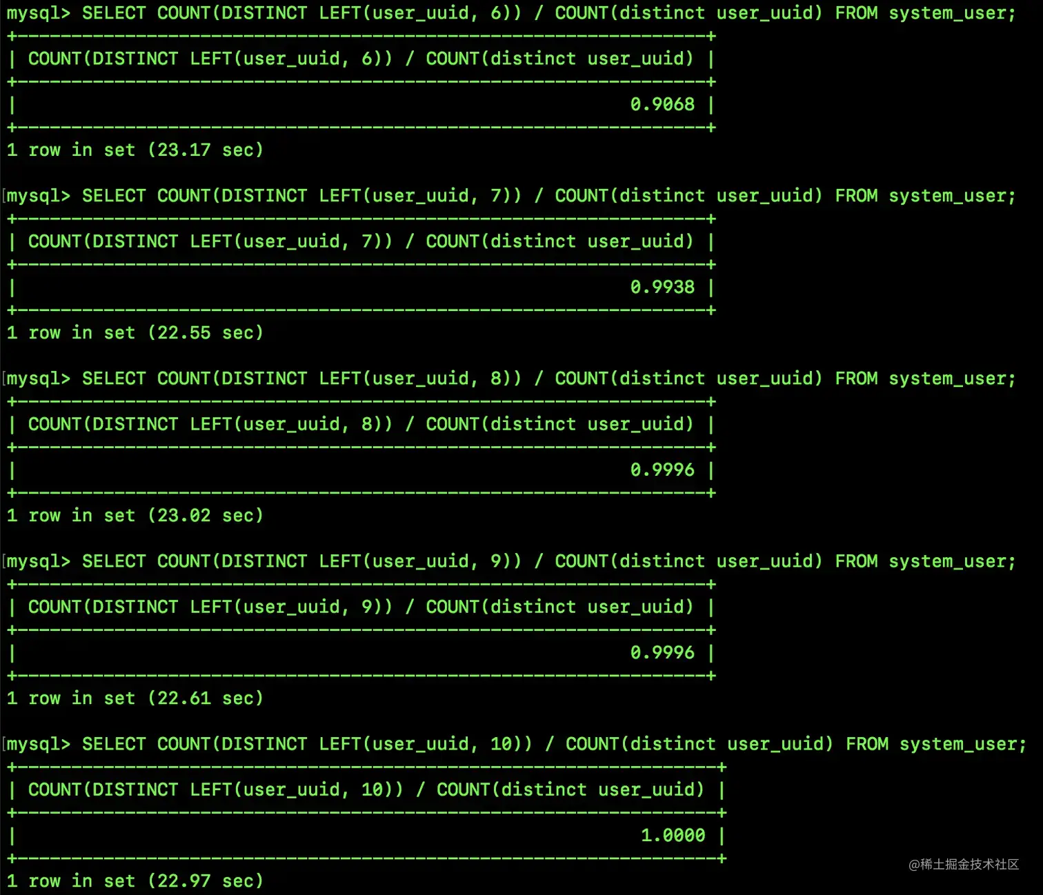 8 和 9 的选择性是一样的,因为在 uuid 字符串中,第 9 个字符串是 -,所有的 uuid 第九个字符串都一样,所以 8 个字符和 9 个字符串的区分度就一样。