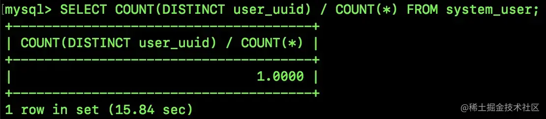 首先我们通过如下 SQL 来看一下 user_uuid 全列索引选择性是多少: