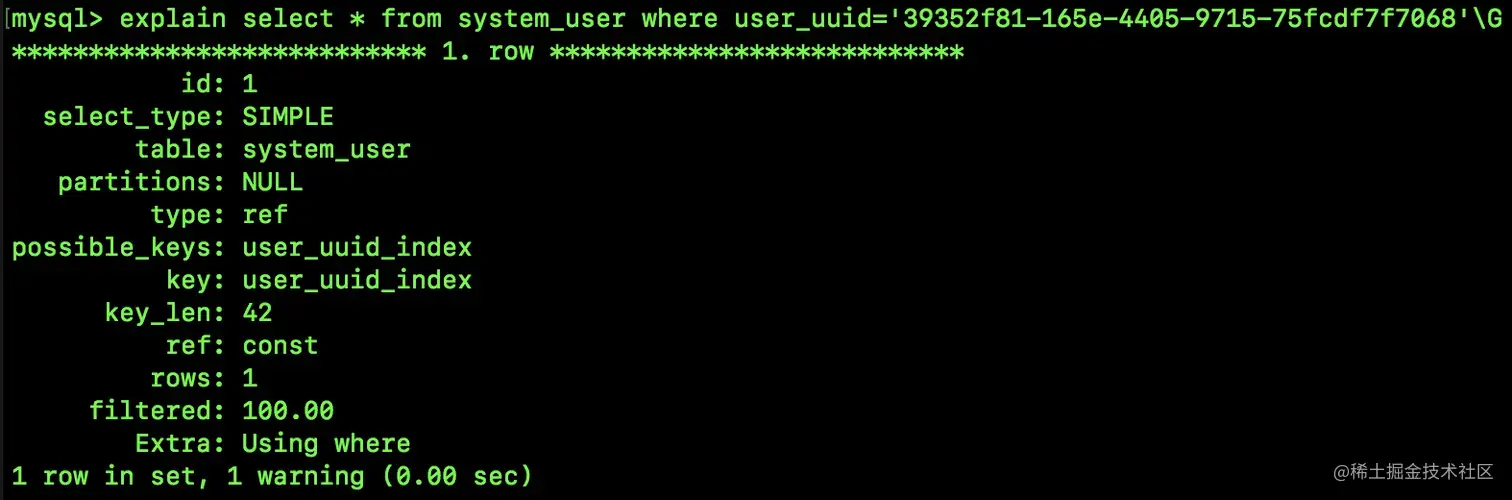 这次不是 select *,而是 select user_uuid,小伙伴们知道,这里应该是要用到覆盖索引,我们来看看执行计划: