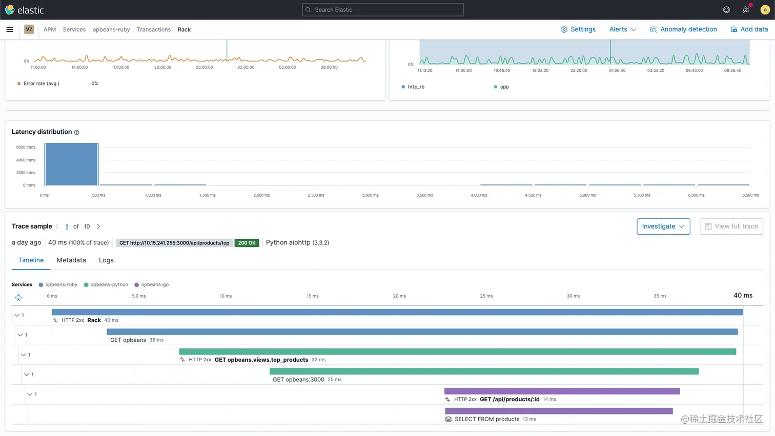 此外,APM 还可以让你查看关键性能指标的历史和趋势,例如延迟和吞吐量,以及 transaction 和依赖信息: