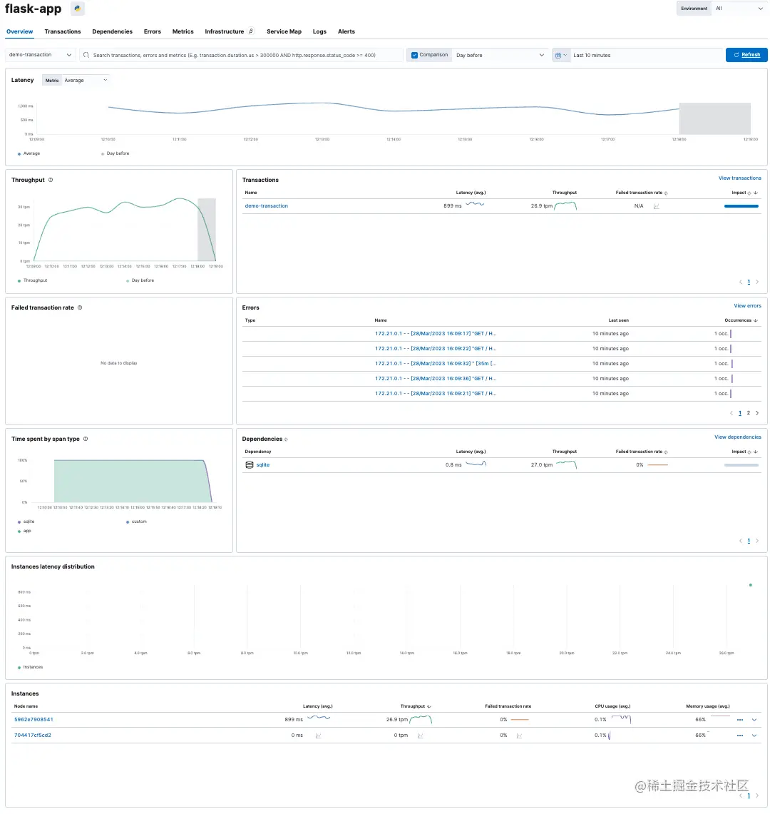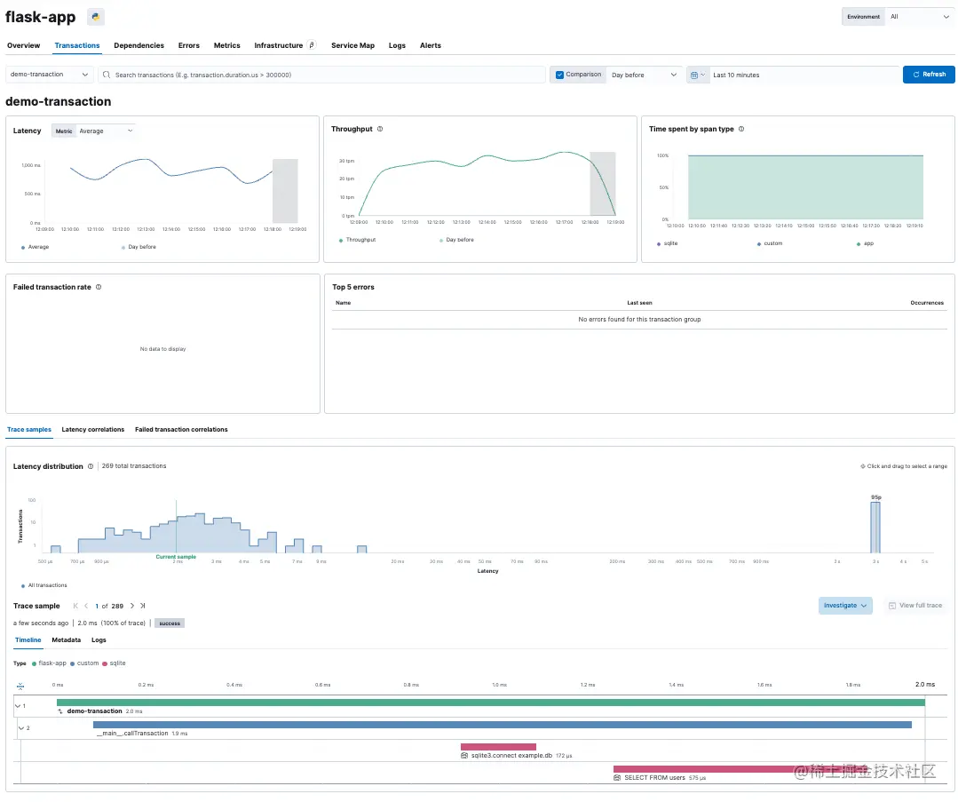 此视图提供了在指定时间段(在本例中为过去 15 分钟)内已将应用程序跟踪数据发送到 Elastic APM 的所有应用程序的列表。 还有迷你图显示延迟、吞吐量和错误率的迷你图。 单击 flask-app 将我们带到 service overview 页面,该页面显示了服务中的各种 transaction(回想一下我的脚本正在访问 / 端点,如 Transactions 部分所示)。 我们得到了更大的延迟、吞吐量、错误和错误率图表。