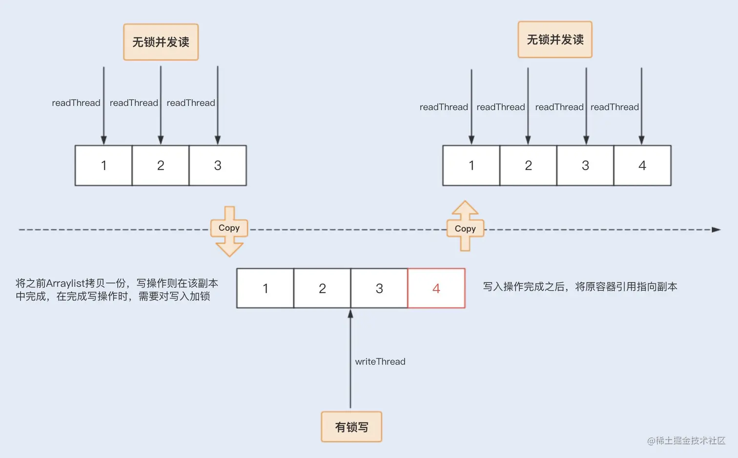 相比之下,CopyOnWriteArrayList 是 java.util.concurrent 包提供的方法,它实现了读操作无锁,写操作则通过操作底层数组的新副本来实现,是一种读写分离的并发策略。我们可以通过以下图示来了解下 CopyOnWriteArrayList 的具体实现原理。