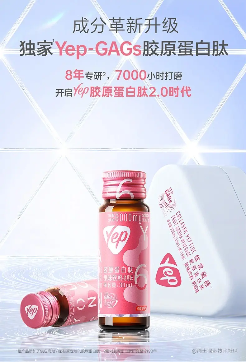 最新上市的“Yep磁感小粉瓶”便基于这一思路诞生。据悉,对比Yep原有胶原蛋白肽产品,新品的独特之处在于原料升级成独家定制的“Yep-GAGs胶原蛋白肽”,主打含有GAGs(糖胺聚糖)成分。