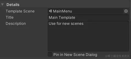 - Details:指定模板使用哪个场景,并包含模板的描述,该内容将出现在 New Scene 对话框中。