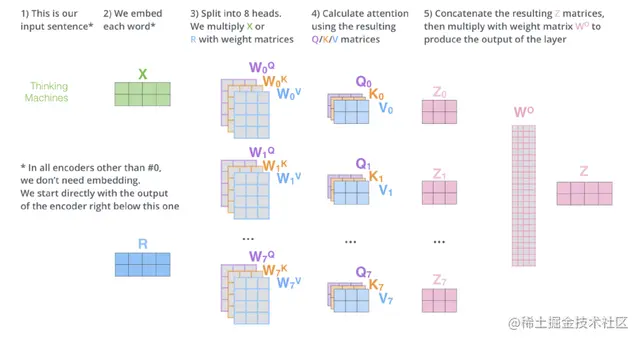 (Jay Alammar:多头注意力块中涉及的各种矩阵大小,Transformer模型(如BERT, GPT2和CLIP)的关键构建块。)