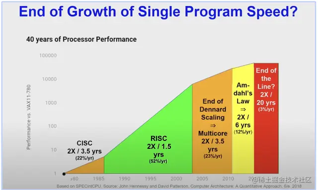 如果你一直在关注AI和硬件的发展,可能听说过摩尔定律时代即将结束。过去60年,单核处理器每18个月翻一倍性能提升速度的情况已然改变。除了继续制造越来越小的晶体管的物理限制之外(例如,电流泄漏会导致功耗过高,从而引起发热),性能也越来越多地受到内存延迟的限制,而这种限制的增长速度比处理速度要缓慢得多。