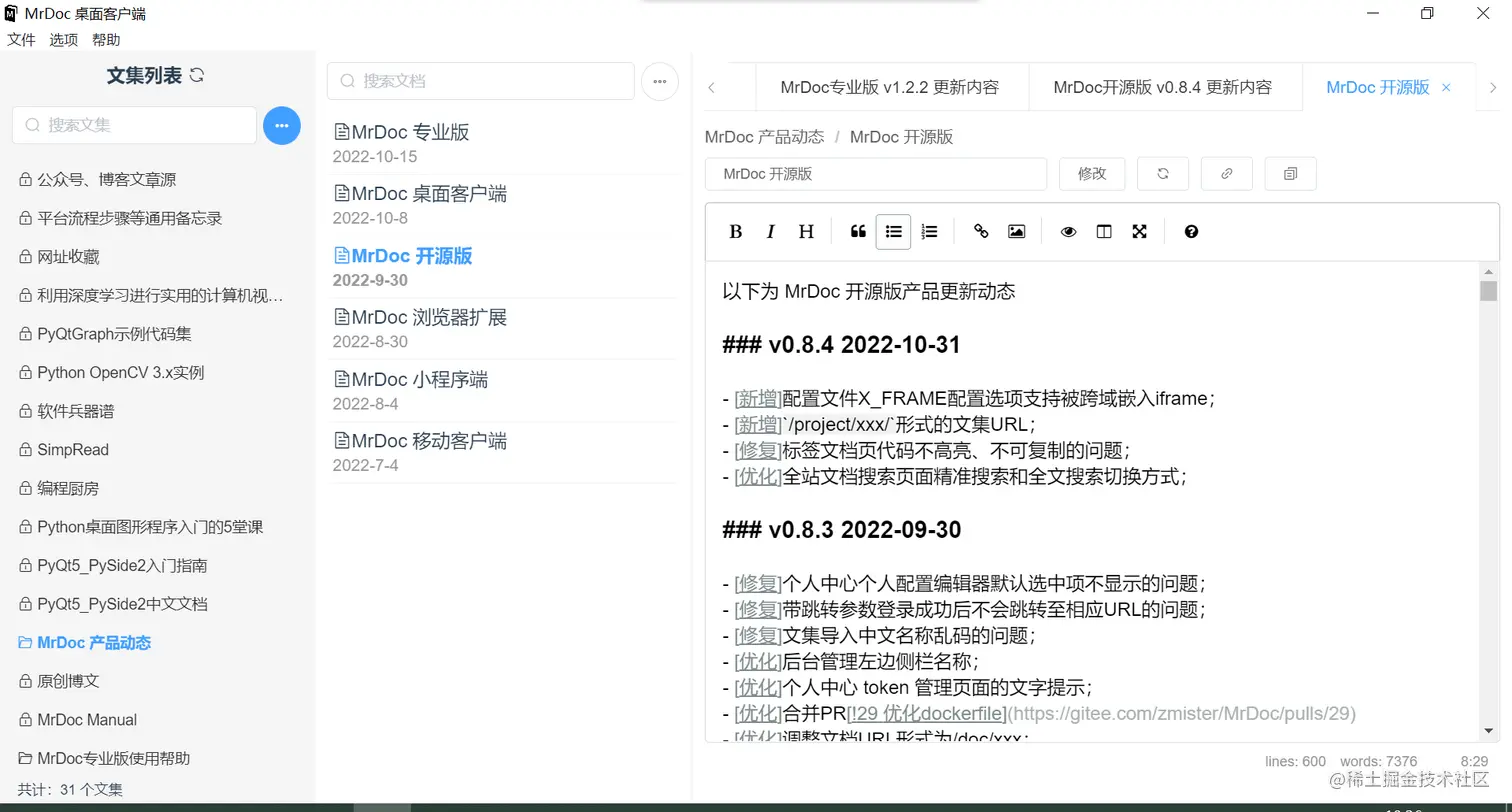MrDoc 还提供了基于 Electron 开发的桌面客户端,跨平台支持 Windows、Linux 和 macOS。
