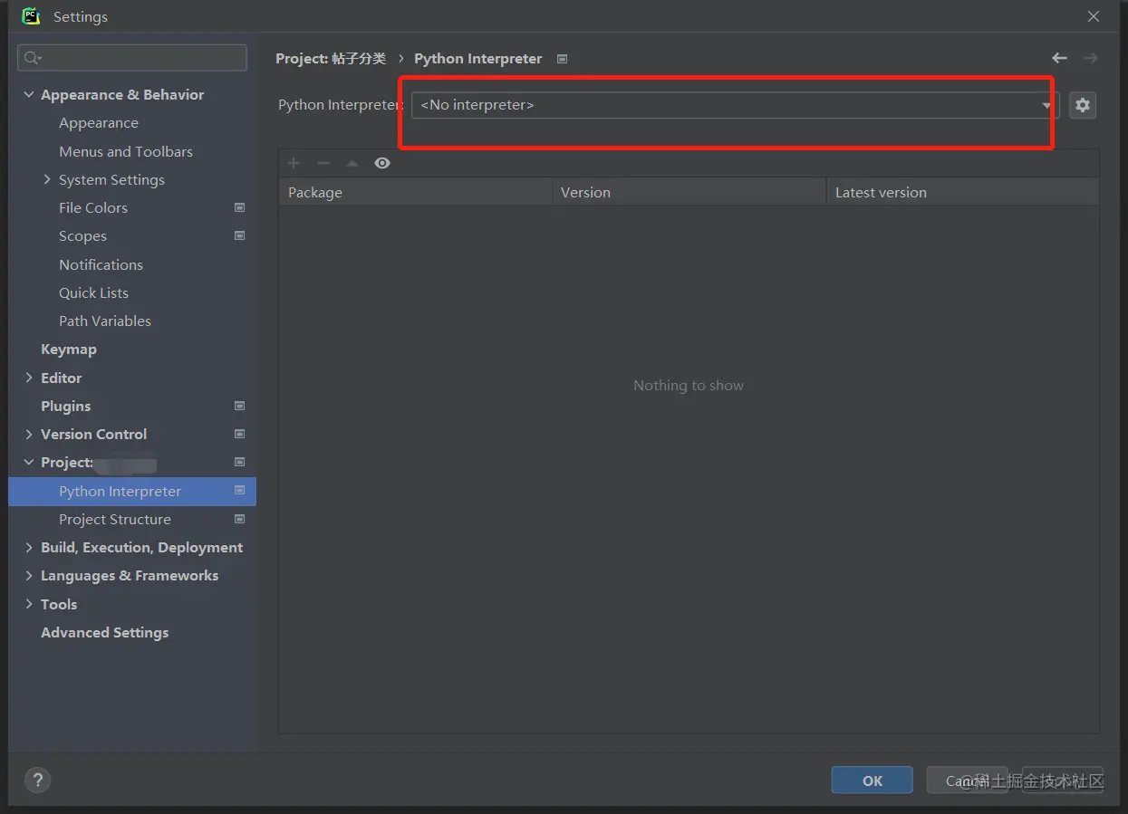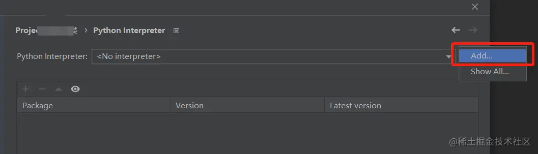 - 显然解释器是空的,需要配置解释器,右上角add添加