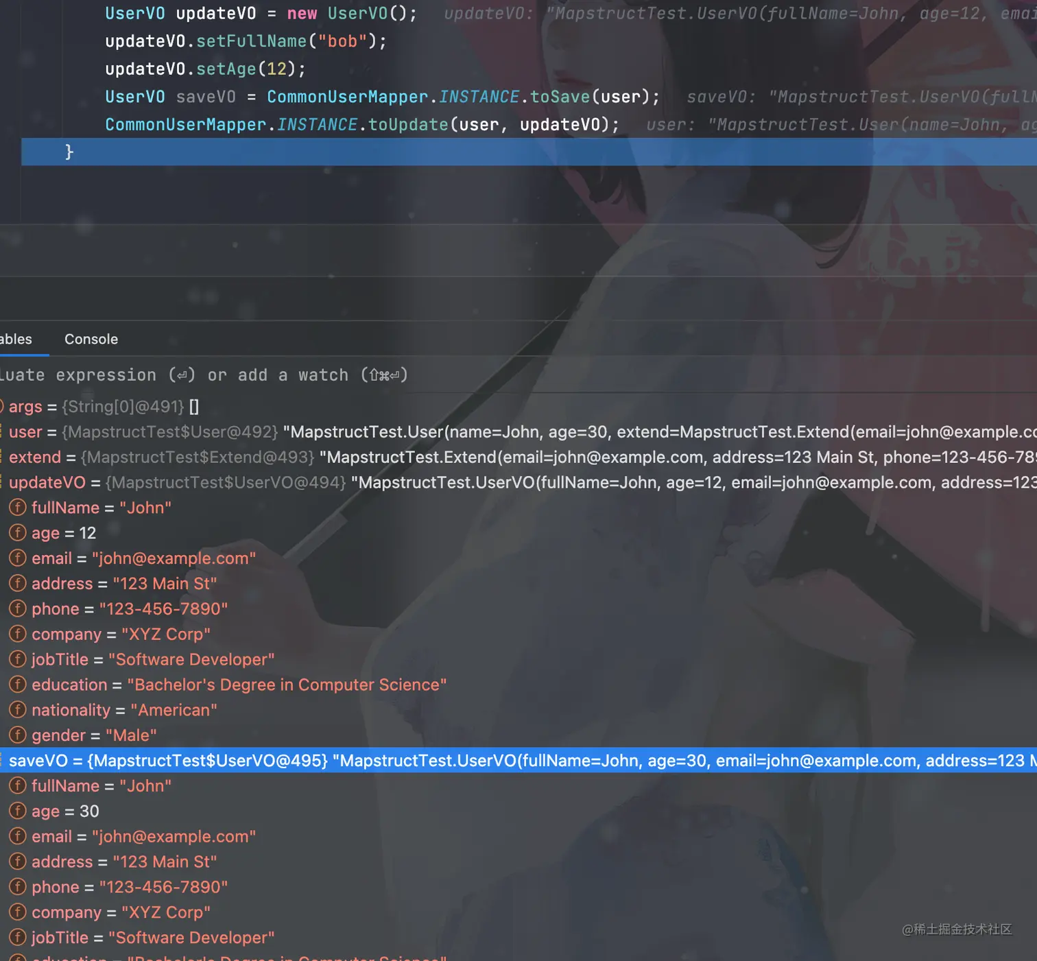 其运行代码如下:UserVO userVO = CommonUserMapper.INSTANCE.toUserVO(user) 。 从运行时变量的结果截图来看,userVO对象中的extend属性和原始User中的extend的对象是同一个,说明我们在不做其他的操作时,