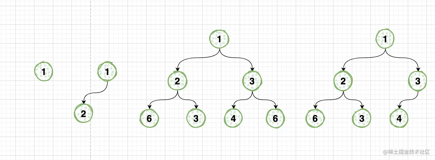 如下图几个都是完全二叉树,因为每一层都是满的,或者从左到右正在逐渐变满。