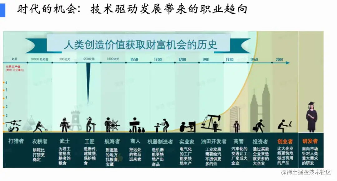 人类社会是技术驱动。从农业时代,人用工具做简单劳动,最大问题是人和土地绑定,人缺少流通性,没有自由。工业发展对人最大变化是人可以动了,可以到城市和工厂。早期工业体系以体力劳动为主、脑力劳动为辅,但随着机械化、电气化、电子化,人的体力劳动下降。信息化时代以后,人以脑力劳动为主,经济从商品经济转向服务经济——码农、设计师、分析师成为我们时代的典型职业。