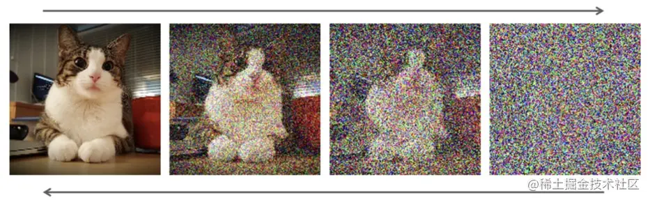 图 8. Stable Diffusion 过程。首先是上面的箭头,一张图片被不断加入噪声,最后变成纯噪声图,然后走下面的箭头,逐渐消除噪声,然后重建最开始的图片。(图源:From DALL・E to Stable Diffusion: how do text-to-image generation models work? | Tryolabs)