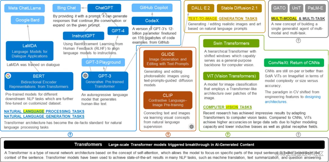 总之,我们可以从这些成果中看到人工智能领域持续创新的活力。无论是 GPT 还是 BERT,还是 Vision Transformer、DALL-E、CLIP、Stable diffusion 等,这些成果都代表着人工智能领域的最新进展。