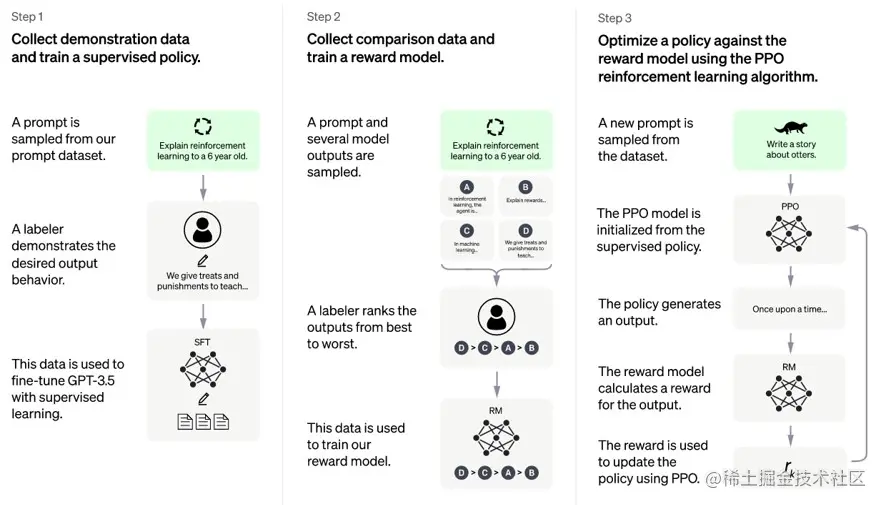- GPT3.5 的人类反馈是直接用于微调模型的参数,而 Instruct GPT 的 RLHF 是用于训练一个奖励模型,然后用这个奖励模型来指导模型的行为。