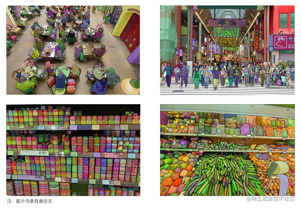 简单来说,我们可以将 SAM 看作一个高效的 “图像剪辑大师”,它能够通过各种输入提示来精确地识别和分割图像中的各种对象。例如,当我们在图像中用鼠标点击一个点时,SAM 会像一个经验丰富的画家一样,自动剪切出该点所在的对象;当我们输入 “猫” 这个词时,SAM 就会像一个聪明的侦探一样,自动找出并剪切出图像中所有的猫;当我们给 SAM 一个目标检测框时,SAM 就会像一个熟练的手术医生一样,准确地剪切出框内的对象。SAM 的零样本泛化能力使其成为一个真正的 “通用剪辑大师”。这意味着无论是常见的对象,如汽车、树木和建筑,还是罕见的对象,如恐龙、外星人和魔法棒,SAM 都可以毫不费力地识别和剪切。这种强大的能力源于其先进的模型设计和庞大的数据集。我从原论文里选了四张很复杂的场景实例(图 10),说明了 SAM 到底可以做什么。