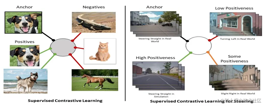 图 6. 对比学习(Contrastive Learning)图示 [14]。Anchor 就是原始图像,positives 一般是经过裁切、旋转后的原始图像,或是已知的相同类别的图像,negatives 可以被简单粗暴的定义为未知的图像(有可能是同一类别),或者是已知的不同类别的图像。