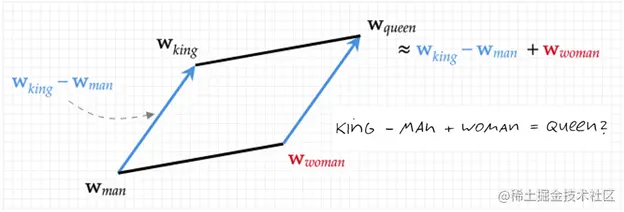 图 2. Word2Vec 图解 (King - Man + Woman = Queen)