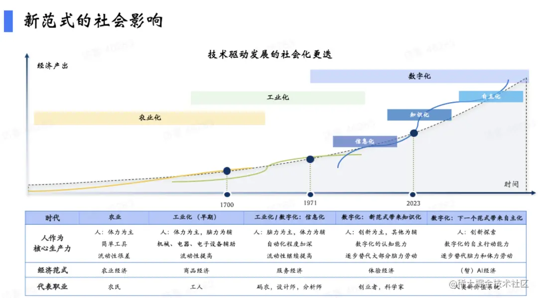 人类社会是技术驱动。从农业时代,人用工具做简单劳动,最大问题是人和土地绑定,人缺少流通性,没有自由。工业发展对人最大变化是人可以动了,可以到城市和工厂。早期工业体系以体力劳动为主、脑力劳动为辅,但随着机械化、电气化、电子化,人的体力劳动下降。信息化时代以后,人以脑力劳动为主,经济从商品经济转向服务经济——码农、设计师、分析师成为我们时代的典型职业。