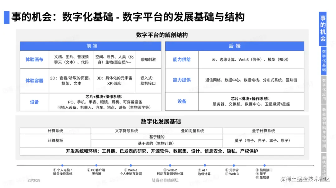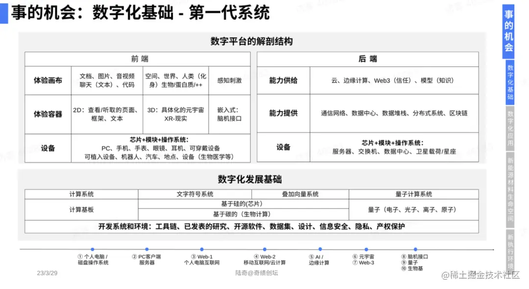 首先,底层是数字化的技术,因为数字化是人的延伸。数字化的基础里有平台,有发展基础,包括开源的代码、开源的设计、开源的数据;平台有前端、后端等。这里有大量机会。