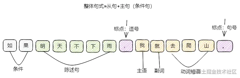 我们回忆一下以前上语文课学一个句子怎么学的,以下面这句话为例子:如果明天不下雨,我就去爬山。