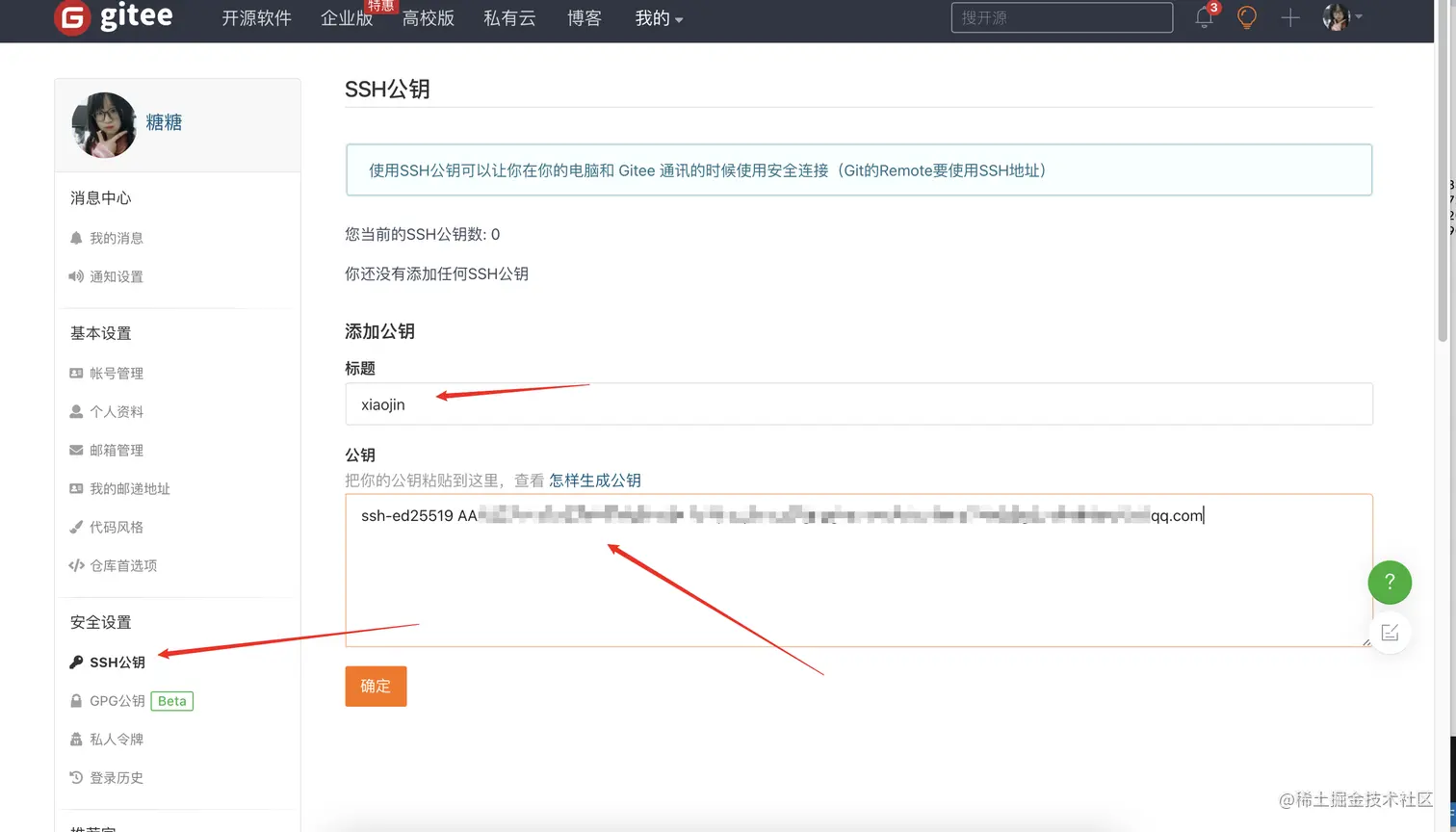 登录你的码云,鼠标移入头像,设置。点击 SSH公钥,打开配置页面,参考下图配置~