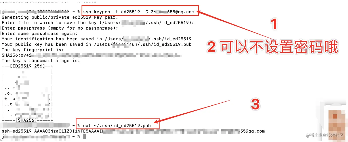 - 按照提示(可以为空,也可以设置密码)完成三次回车,即可生成 ssh key。