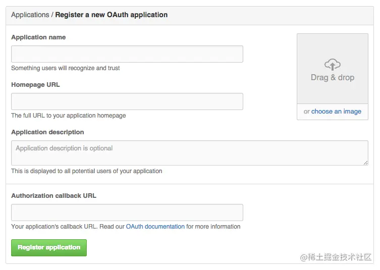 下面是 GitHub 注册应用的界面。在其中,他们收集了应用程序名称、主页 URL、回调 URL 和可选描述。