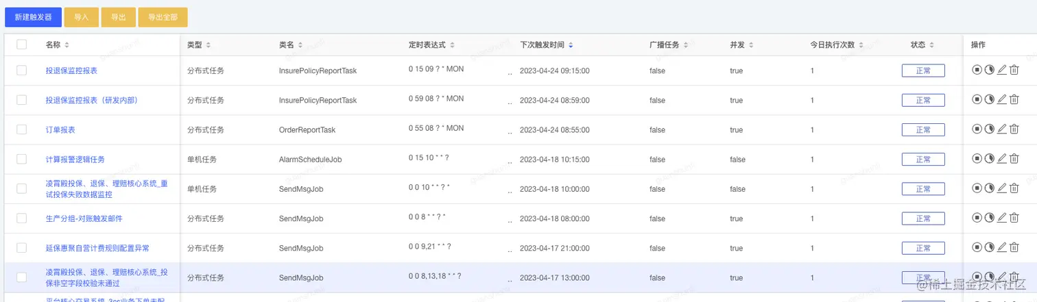 任务中心是指EasyJob,是和报警规则强绑定的。调度任务分为两类,一类是业务类任务,是动态去创建的任务,按照设置的corn执行。另一类是平台任务。用于维护业务类任务的,比如定期去删除没有异常的任务等。(图9)