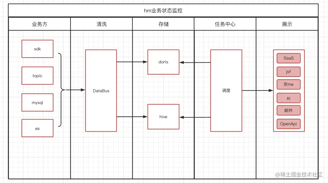 hm的主要职责在业务数据的归纳、分拣。除了埋点接入外还支持,mq、数据库等数据源的接入。所有的数据统一有集团的DP(DataPilot )平台的DataBus系统的DTS完成,统一进数仓的FDM/BDM层。再由集团的调度中心Buffalo(EMR),配置的spark任务执行数据分拣。最终数据进入doris/hive/es中存储。