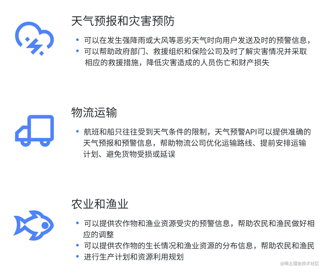例如当某个地区发布了暴雨预警时,API 会及时将预警信息推送给使用者。这样可以方便人们及时了解天气变化,减少因天气变化造成的损失。