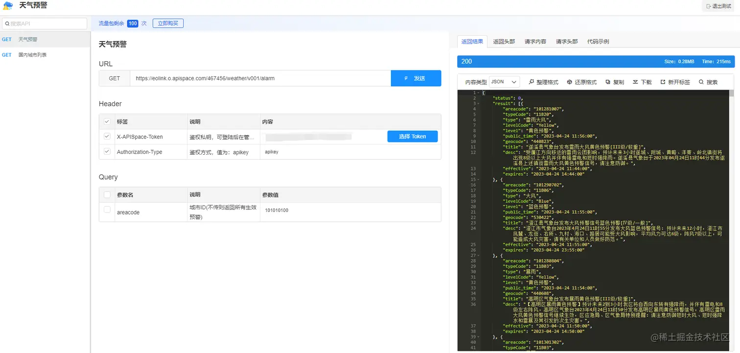 点击免费试用成功后,系统会自动进入 API 的测试界面,如下图,我们只需要填入城市的编码,就能查询到该城市的天气预警信息。