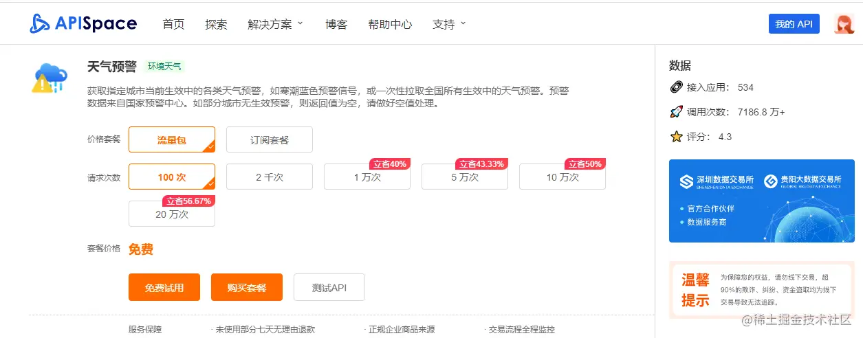 以 APISpace 为例,使用天气预警 API 的步骤通常如下: