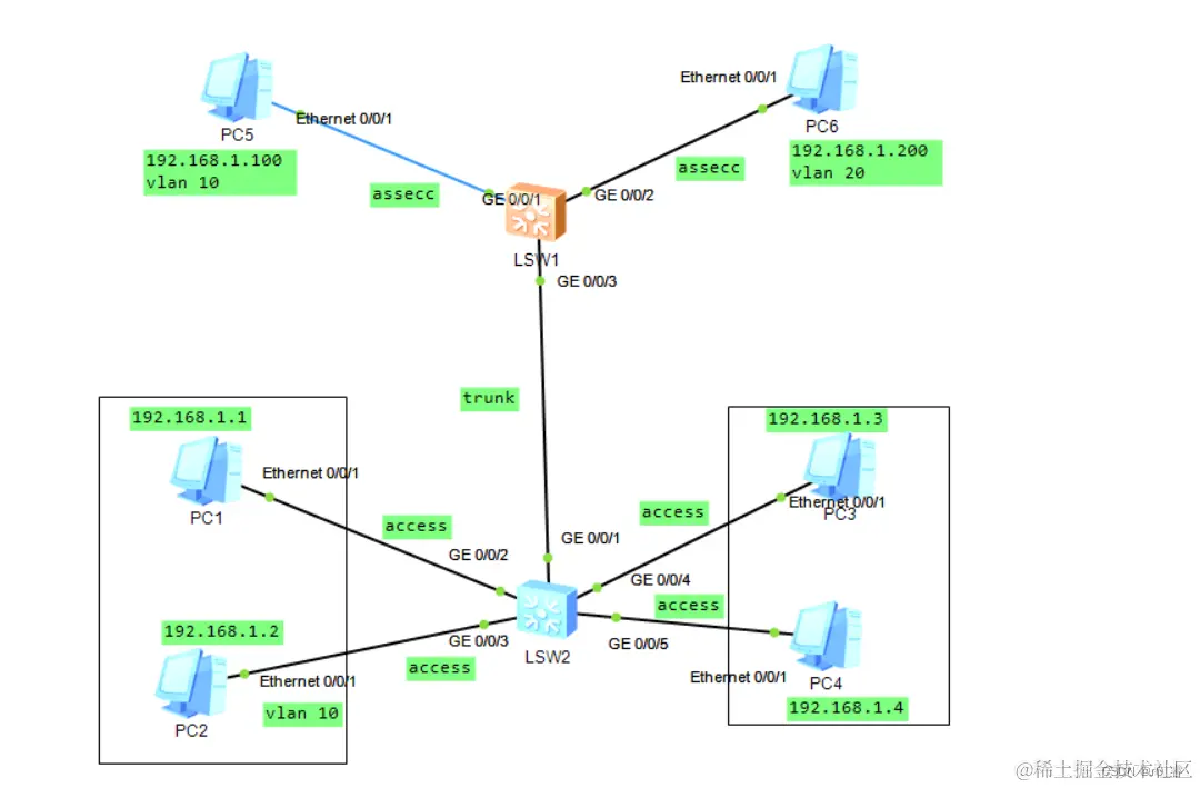 两个交换机之间用trunk