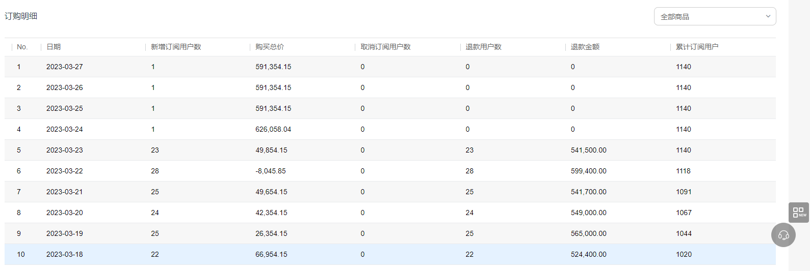 除基本指标和订阅趋势图外,订阅分析还提供了详细的订购明细列表。支持按照不同的套餐类型筛选查询所选时间段内的每日用户订阅详情,清晰明了地呈现用户的具体订阅付费明细。