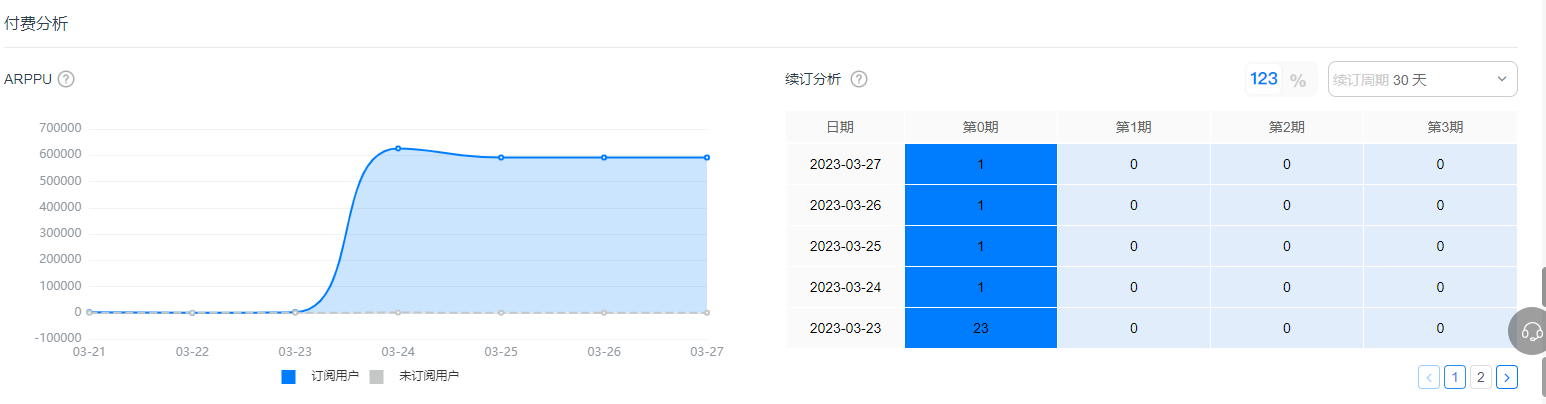 付费分析分为ARPPU和续订分析两个模块,通过对比订阅用户与非订阅用户在应用内的购买金额差异,可以更直观地了解订阅用户和非订阅用户的付费偏好差异,并且从整体评估实际每日收入中订阅用户和非订阅用户的贡献占比。