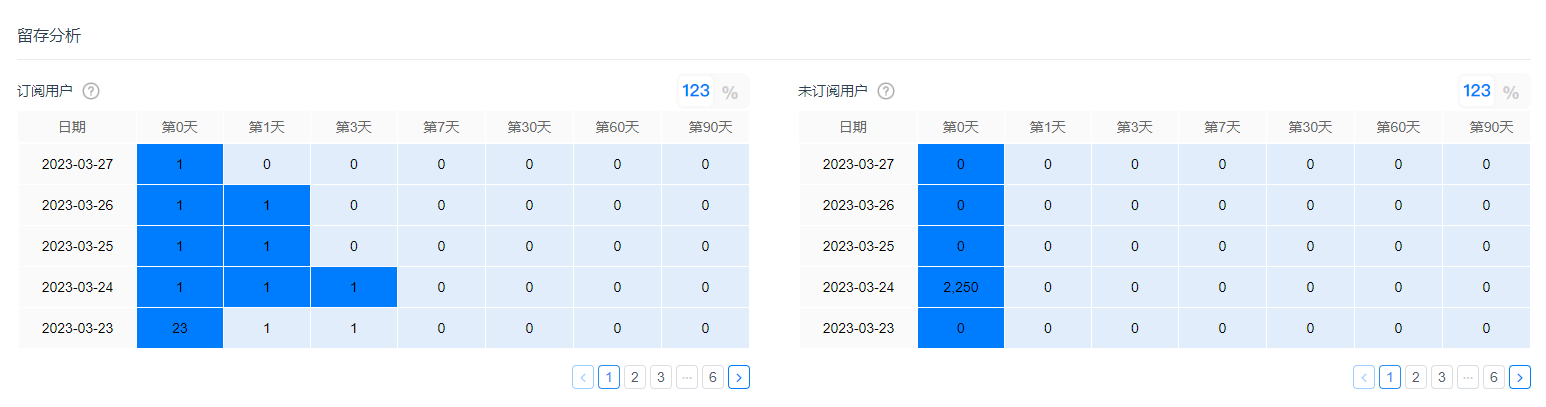 留存分析模块,可分别查看订阅用户的活跃留存和非订阅用户的活跃留存,通过直观对比,整体评估游戏内的订阅付费策略对于提升用户留存的价值。