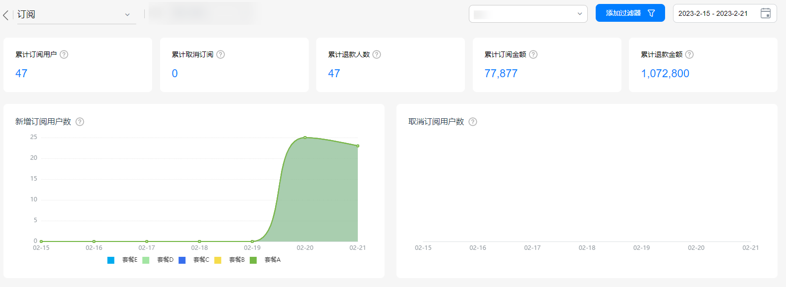 通过累计订阅用户、累计取消订阅、累计订阅金额等指标,可以对当前应用内的订阅净增长做到心中有数。不同套餐的新增订阅与取消订阅趋势图,有助于进一步分析用户的订阅付费偏好,基于分析结果可合理调优套餐内容与具体定价。