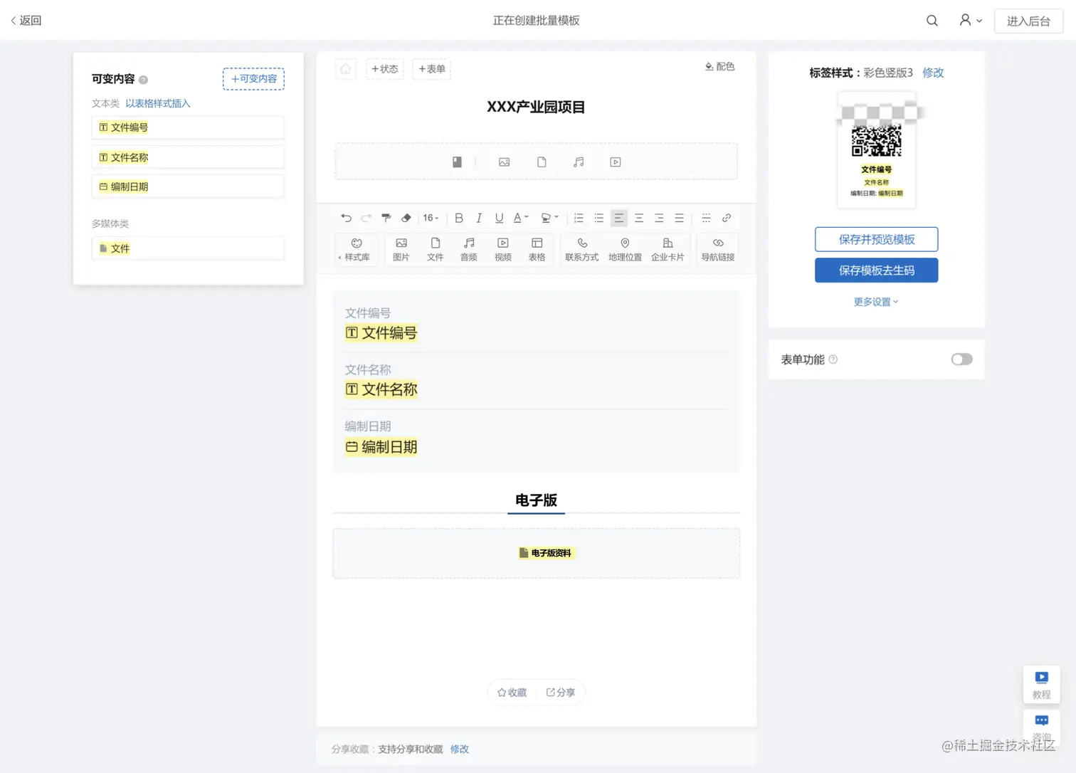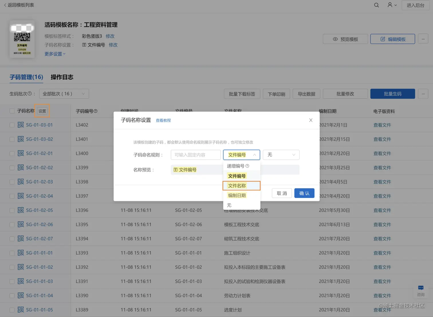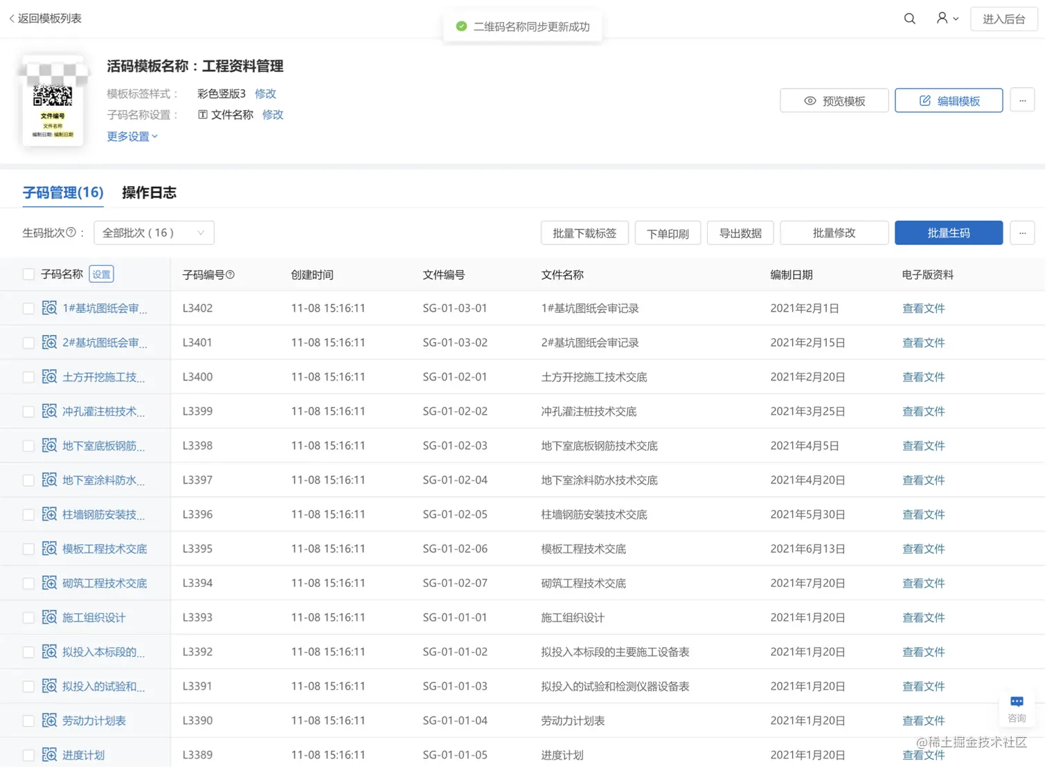 草料二维码的模板库中有工程资料管理的模板,可以直接点击模板,选择批量生码,按照实际需求对模板中的内容进行修改即可。