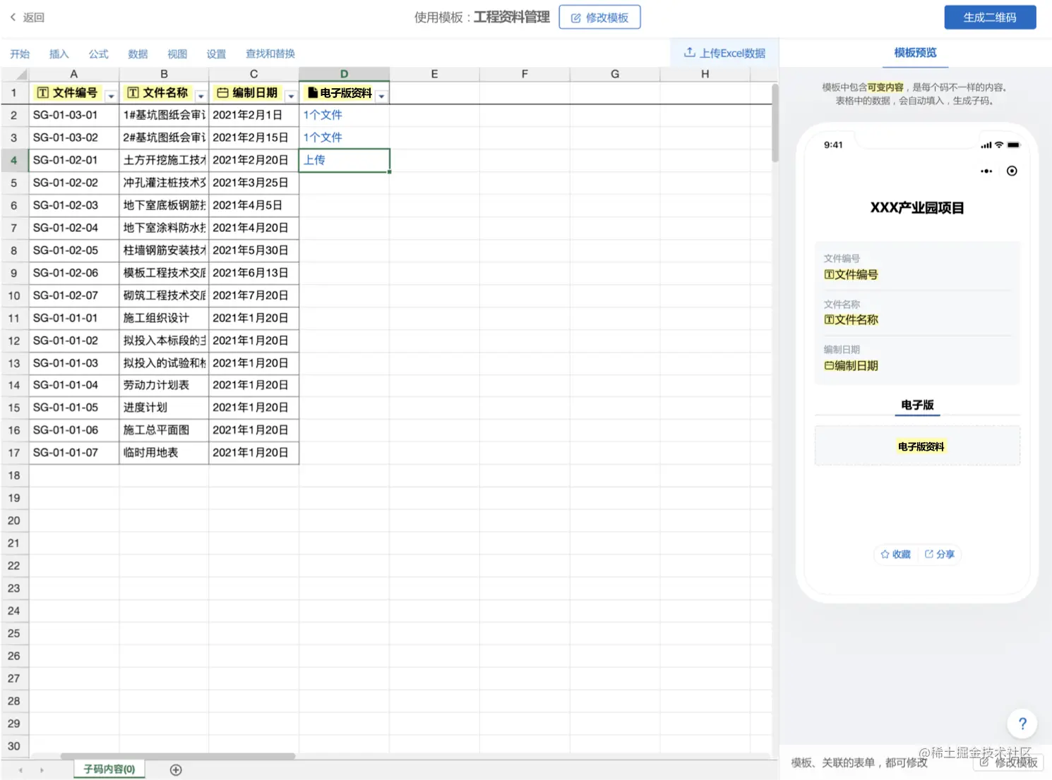 在这个界面,可以直接填写文本类的可变内容数据:文件编号、文件名称、编制日期,也可以上传符合格式要求的本地Excel文件。