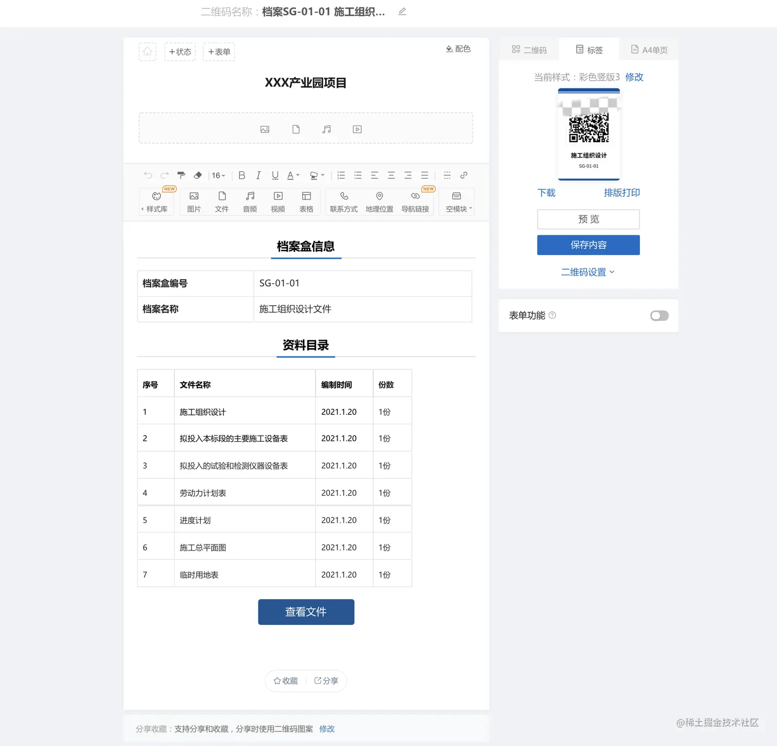 3、为档案盒制作二维码标识,扫码显示档案盒编号和资料目录,并能链接到电子版文件汇总码;