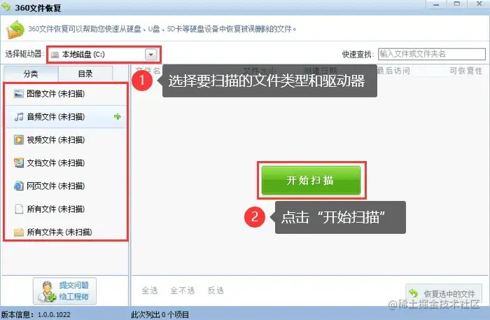 2.在 【选择驱动器】 后选择要进行扫描的磁盘,并在下方选择要扫描的文件类型,点击 【开始扫描】 ;