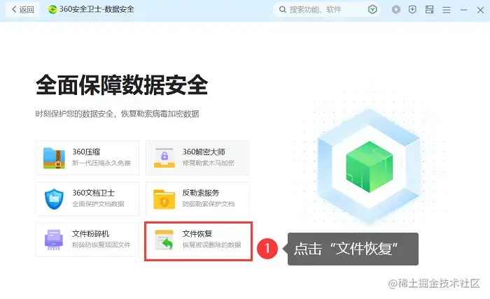 我们的360安全卫士自带了文件恢复功能。如果你的文件是被360在清理垃圾时删除的,不用担心,我们可以借助360软件自带的 【文件恢复】 功能找回删除的文件,具体操作步骤如下: