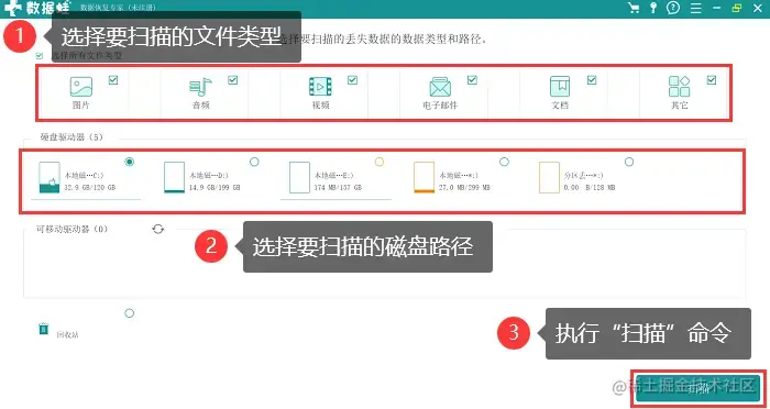 2.在主界面中可看到很多文件类型,选择您所需要扫描的文件类型(新手建议全选),并选择要扫描的磁盘(如果不确定文件在哪个磁盘,可多扫描几次),点击 【扫描】 ;