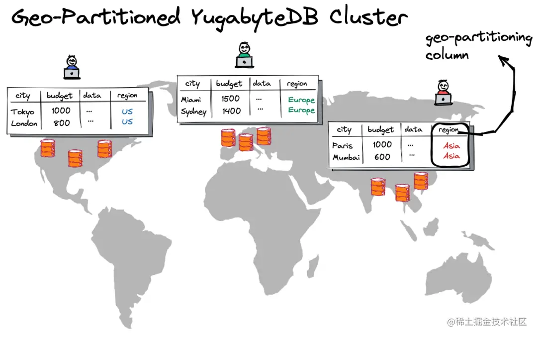 自定义地理分区列(上图中的“region”列)允许数据库决定目标行的位置。