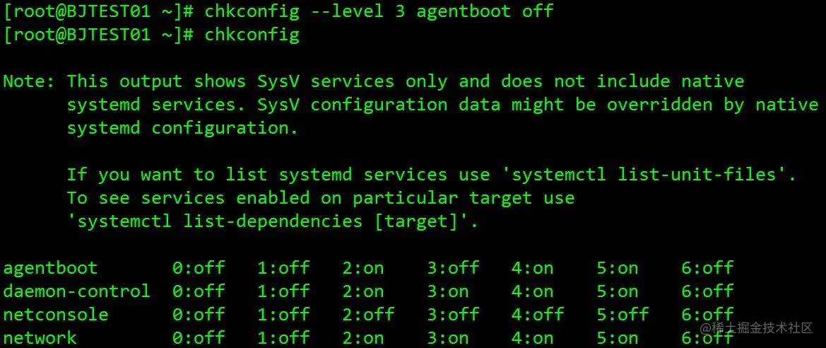 执行命令chkconfig,可以看到agentboot在运行级别3下的状态是off。