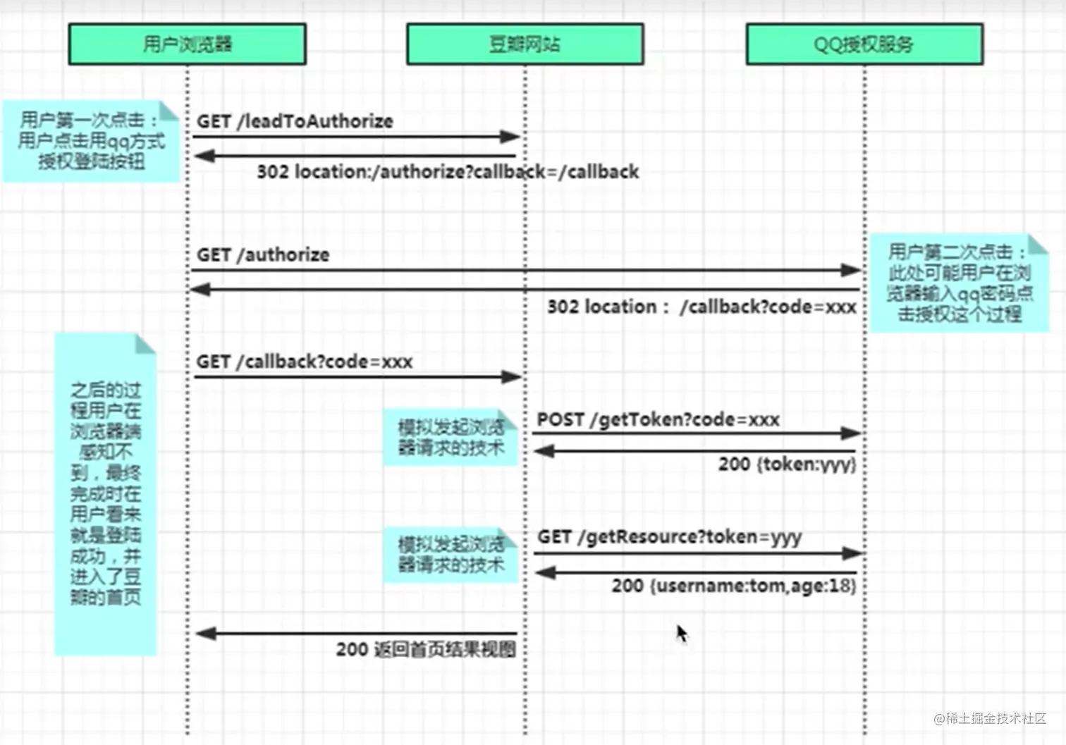 比如在豆瓣网站选择使用QQ登录后,豆瓣网站会发起一个重定向302