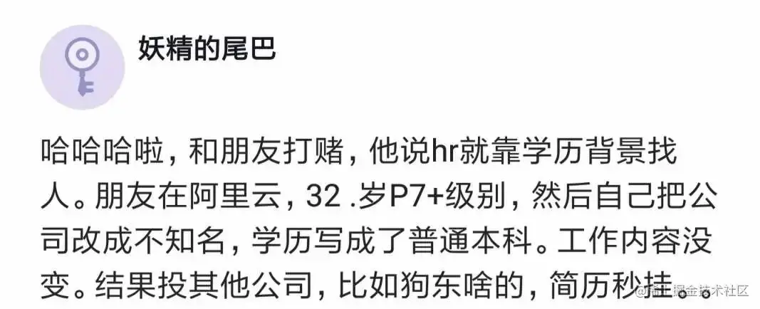 朋友在阿里云,32岁,P7,他把简历上的公司改成不知名,学历改成普通本科,工作内容不变,结果投其他公司(比如京东),简历秒挂。
